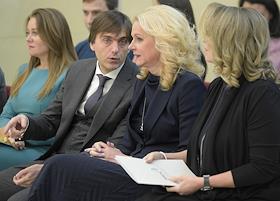 Церемония открытия Дня российского студенчества в Национальном исследовательском технологическом университете (НИТУ) "МИСиС". Справа налево: ректор НИТУ "МИСиС" Алевтина Черникова, заместитель председателя правительства России Татьяна Голикова и руководитель Федеральной службы по надзору в сфере образования и науки Сергей Кравцов во время церемонии.