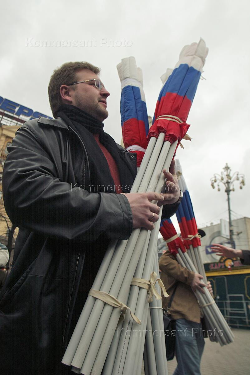 Митинг против цензуры, организованный группой "Я свободен", прошел на Пушкинской площади. Таким образом было отмечено пятилетие "разгона" "НТВ". Мужчины с повязками дружинников на митинге следят за общественным порядком.