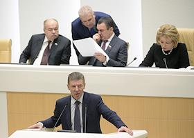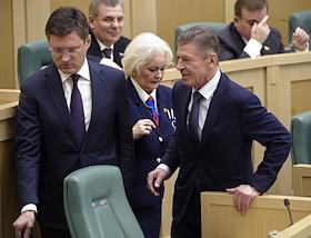Пленарное заседание Совета Федерации (СФ) России. Министр энергетики России Александр Новак (справа) и заместитель председателя правительства России Дмитрий Козак (второй справа) во время заседания.