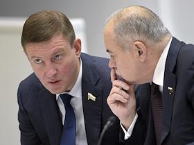 Пленарное заседание Совета Федерации (СФ) России. Заместители председателя СФ России Андрей Турчак (слева) и Ильяс Умаханов (справа) во время заседания.