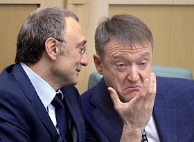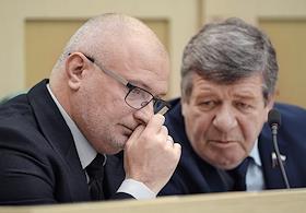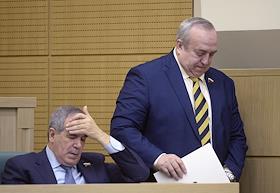 Пленарное заседание Совета Федерации (СФ) России. Представитель от законодательного (представительного) органа государственной власти Республики Дагестан Сулейман Керимов (слева) и представитель в Совете Федерации от исполнительного органа государственной власти Калининградской области Олег Ткач (справа) во время заседания.