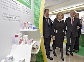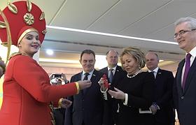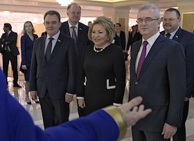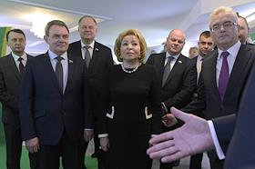 Пленарное заседание Совета Федерации (СФ) России. Председатель СФ России Валентина Матвиенко (справа) и председатель Законодательного собрания Пензенской области Валерий Лидин (второй слева) во время презентации дней Пензенской области в СФ России.