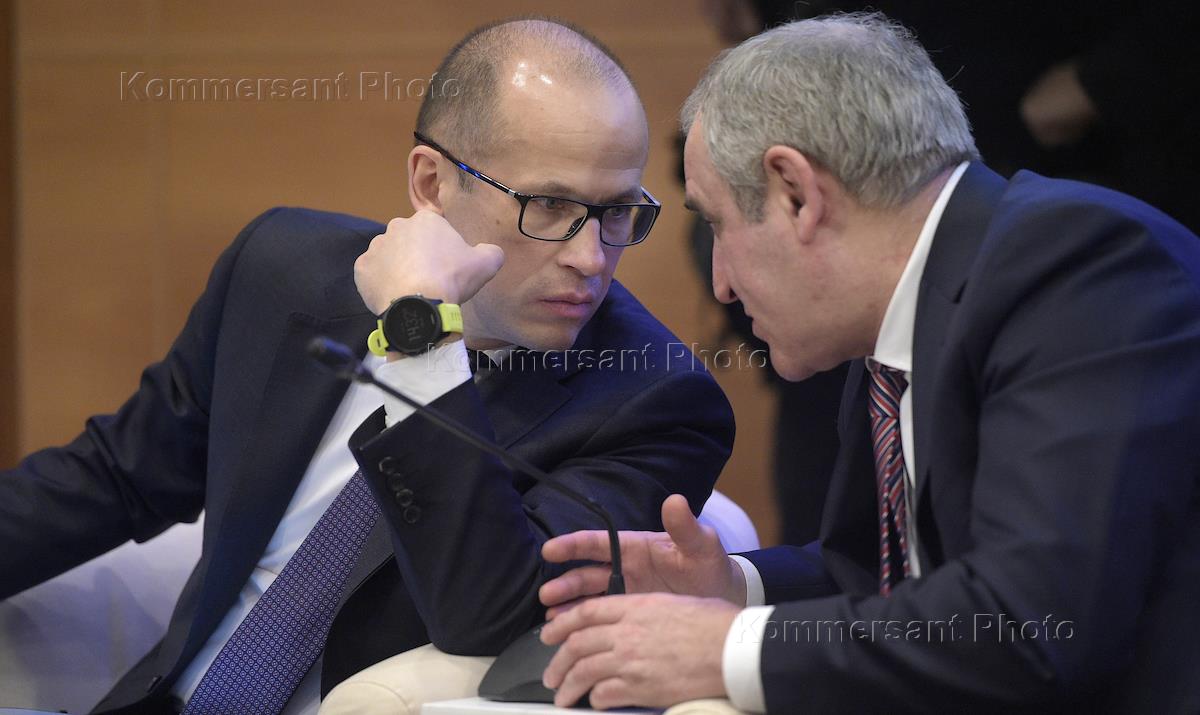 Съезд Общероссийского конгресса муниципальных образований в Государственной думе (ГД) России. Член комитета ГД по федеративному устройству и вопросам местного самоуправления Виктор Кидяев (слева) и заместитель председателя Правительства России Виталий Мутко (справа) во время съезда.