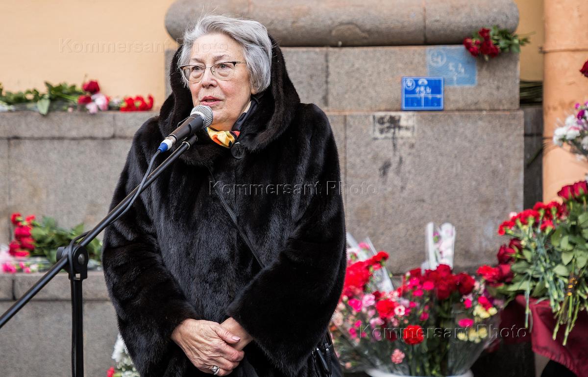 Церемония открытия мемориальной доски в память о писателе Данииле Гранине на фасаде дома № 8 по Малой Посадской улице в Санкт-Петербурге. Директор Центральной городской публичной библиотеки имени В.В. Маяковского Санкт-Петербурга, президент Петербургского библиотечного общества Зоя Чалова во время церемонии.