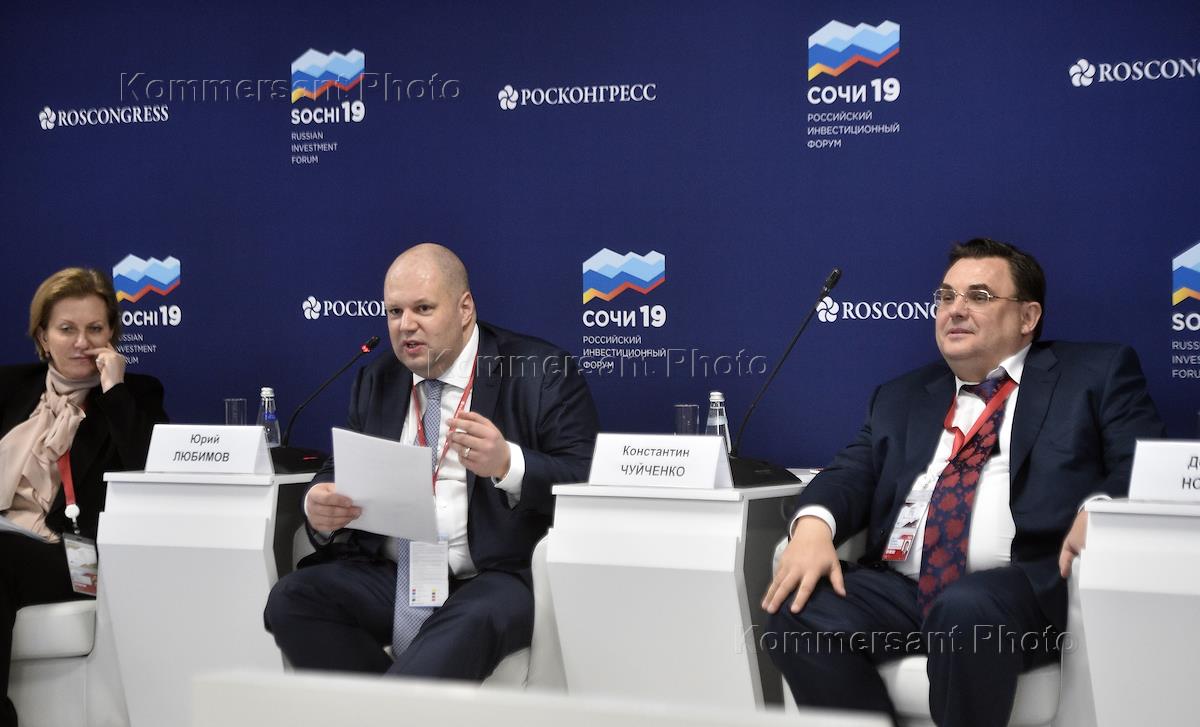 Российский инвестиционный форум "Сочи-2019". Слева направо: руководитель Федеральной службы по надзору в сфере защиты прав потребителей и благополучия человека (Роспотребнадзор) Анна Попова, статс-секретарь - заместитель министра юстиции России Юрий Любимов и заместитель председателя правительства России - руководитель Аппарата правительства России Константин Чуйченко на сессии "Финансовая грамотность населения как основа для финансовой стабильности" в Главном медиацентре Олимпийского парка.