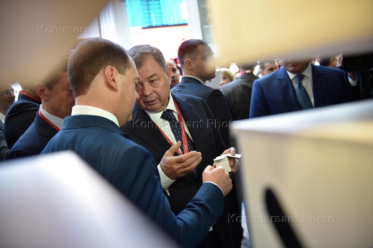 Рабочая поездка председателя Правительства Дмитрия Медведева в Сочи. Российский инвестиционный форум. Председатель правительства России Дмитрий Медведев (в центре) и временно исполняющий обязанности главы Республики Башкирия Радий Хабиров (справа) во время осмотра выставки в рамках Российского инвестиционного форума в Главном медиацентре Олимпийского парка.