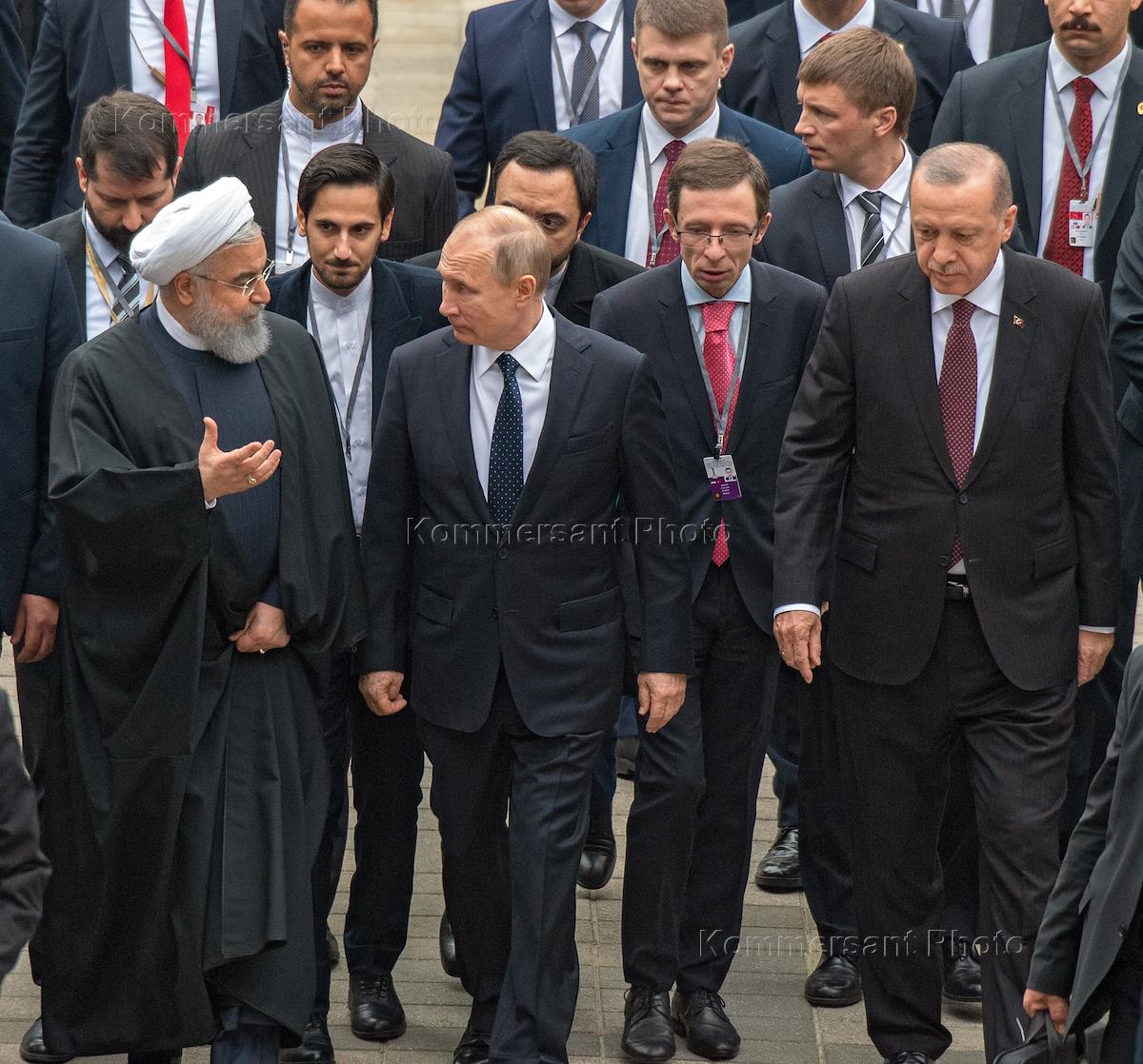 Рабочая поездка президента России Владимира Путина в Сочи. Четвертая трехсторонняя встреча глав государств- гарантов Астанинского процесса содействия сирийскому урегулированию. Слева направо: президент Ирана Хасан Роухани, президент России Владимир Путин и президент Турции Реджеп Тайип Эрдоган во время встречи.