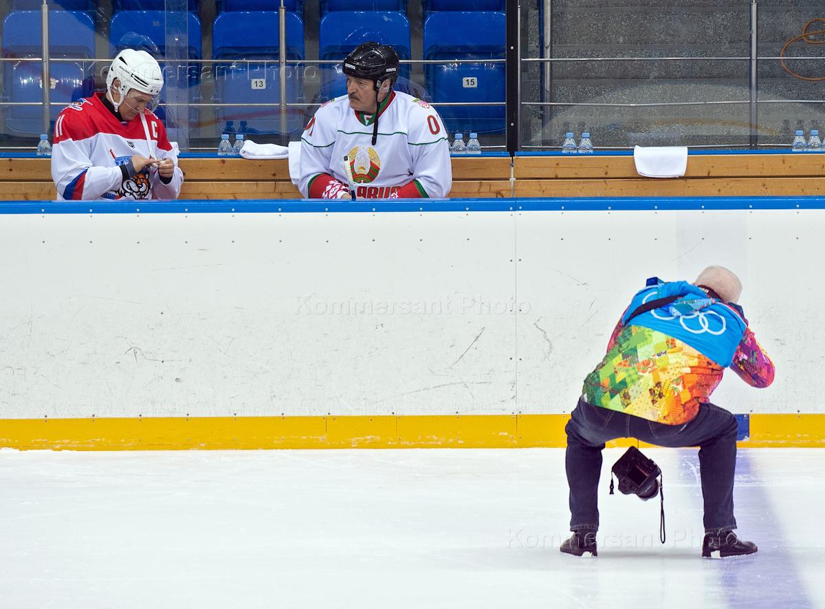 Рабочая поездка президента России Владимира Путина в Сочи. Президент России Владимир Путин (справа) и президент Белоруссии Александр Лукашенко (слева) во время тренировочной игры в хоккей в ледовом дворце "Шайба" в Сочи.
