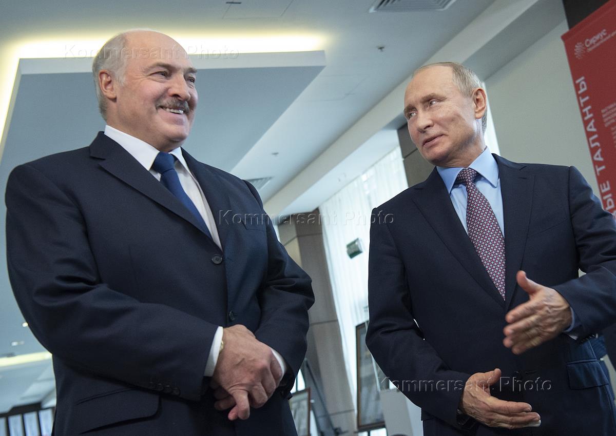 Рабочая поездка президента России Владимира Путина в Сочи. Президент России Владимир Путин (справа) и президент Белоруссии Александр Лукашенко (слева) общаются с журналистами после встречи в образовательном центре "Сириус" в Сочи, посвященной сотрудничеству двух стран в сферах образования, культуры и спорта.