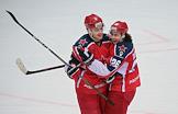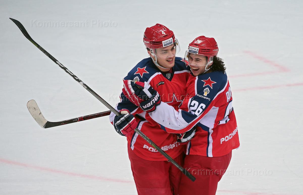 Континентальная хоккейная лига (КХЛ). Матч между командами ЦСКА (Россия, Москва) и "Витязь" (Россия, Подольск) прошел на стадионе "ЦСКА Арена". Игроки команды ЦСКА Клас Дальбек (слева) и Кирилл Капризов (справа) во время матча.