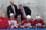 Континентальная хоккейная лига (КХЛ). Матч между командами ЦСКА (Россия, Москва) и "Витязь" (Россия, Подольск) прошел на стадионе "ЦСКА Арена". Главный тренер команды "Витязь" Валерий белов (в центре, слева) во время матча.