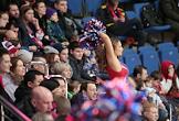 Континентальная хоккейная лига (КХЛ). Матч между командами ЦСКА (Россия, Москва) и "Витязь" (Россия, Подольск) прошел на стадионе "ЦСКА Арена". Девушка во время исполнения черлидинга на зрительской трибуне во время матча.