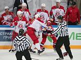 Континентальная хоккейная лига (КХЛ). Матч между командами ЦСКА (Россия, Москва) и "Витязь" (Россия, Подольск) прошел на стадионе "ЦСКА Арена". Игроки команды "Витязь" во время матча.