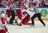 Континентальная хоккейная лига (КХЛ). Матч между командами ЦСКА (Россия, Москва) и "Витязь" (Россия, Подольск) прошел на стадионе "ЦСКА Арена". Игрок команды ЦСКА Антон Слепышев (слева) и игрок команды "Витязь" Павел Чернов (справа) во время матча.