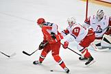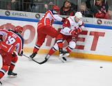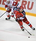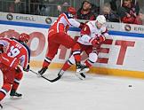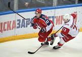 Континентальная хоккейная лига (КХЛ). Матч между командами ЦСКА (Россия, Москва) и "Локомотив" (Россия, Ярославль) прошел на стадионе "ЦСКА Арена". Игрок команды "Локомотив" Степан Санников (слева) и игрок команды ЦСКА Сергей Андронов (в центре) во время матча.
