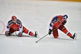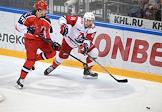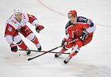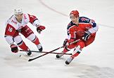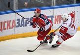 Континентальная хоккейная лига (КХЛ). Матч между командами ЦСКА (Россия, Москва) и "Локомотив" (Россия, Ярославль) на стадионе "ЦСКА Арена". Игрок команды ЦСКА Михаил Науменко (справа) и игрок команды "Локомотив" Андрей Локтионов (слева) во время матча.