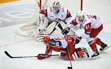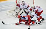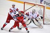 Континентальная хоккейная лига (КХЛ). Матч между командами ЦСКА (Россия, Москва) и "Локомотив" (Россия, Ярославль) на стадионе "ЦСКА Арена". Слева направо: игрок команды "Локомотив" Якуб Накладал, игрок команды ЦСКА Андрей Светлаков и вратарь команды "Локомотив" Александр Салак во время матча.