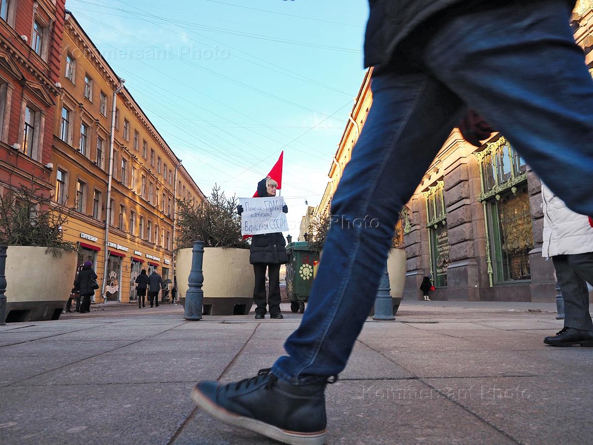 Виды Санкт-Петербруга. Женщина с плакатом: "Пенсии – Голод, за 36-40 лет работы! Верните нам СССР!".