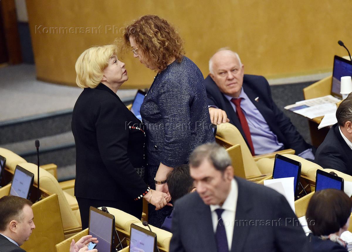 Пленарное заседание Государственной думы (ГД) России. Первый заместитель председателя комитета ГД по культуре Елена Драпеко (слева) и заместитель председателя ГД России Ольга Епифанова (в центре) перед началом заседания.