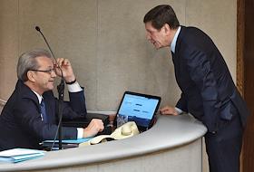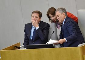 Пленарное заседание Государственной думы (ГД) России. Полномочный представитель президента России в ГД России Гарри Минх (слева) и первый заместитель председателя ГД России Александр Жуков (справа) перед началом заседания.
