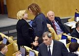Пленарное заседание Государственной думы (ГД) России. Первый заместитель председателя комитета ГД по культуре Елена Драпеко (слева) и заместитель председателя ГД России Ольга Епифанова (в центре) перед началом заседания.