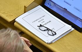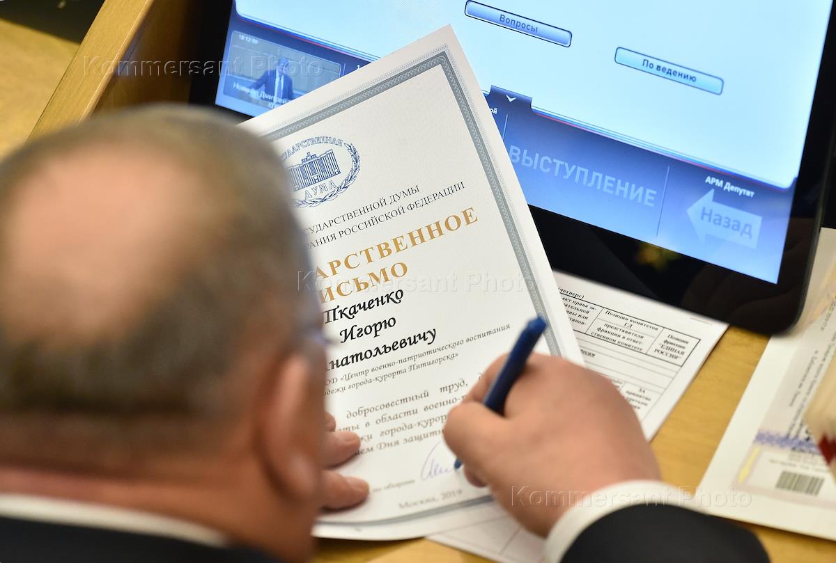 Пленарное заседание Государственной думы (ГД) России. Жанровая фотография. Проект "Строительство жилья для фермеров" лежит на рабочем столе депутат ГД России в зале заседаний.