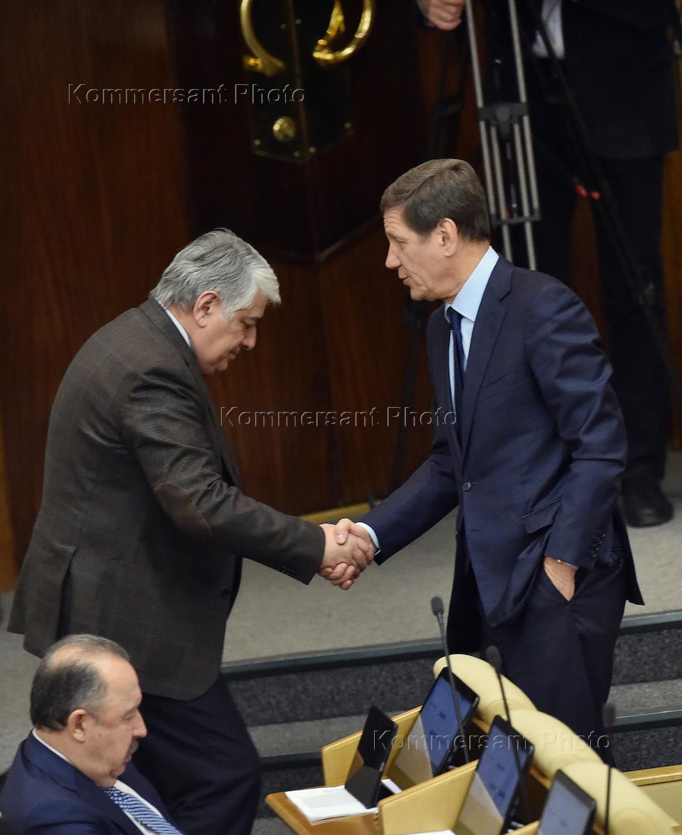 Пленарное заседание Государственной думы (ГД) России. Первый заместитель председателя ГД России Александр Жуков (справа) и член комитета ГД России по государственному строительству и законодательству Отари Аршба (слева) перед началом заседания.