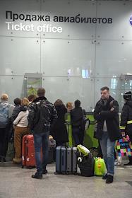 Жанровая фотография. Аэропорт Домодедово. Пассажиры у стойки по продаже авиабилетов на территории аэропорта.