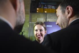Премьера фильма "Юморист" режиссера Михаила Идова состоялась в Доме Кино. Слева направо: актриса Виктория Толстоганова, телеведущая Ксения Собчак и продюсер, режиссер, актер Алексей Агранович на премьере.