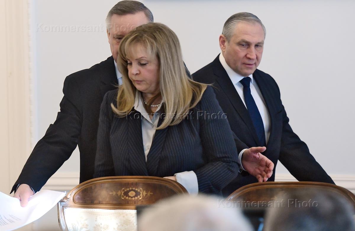 IV заседание Совета председателей избирательных комиссий субъектов России состоялось в Смольном. Временно исполняющий обязанности губернатора Санкт-Петербурга Александр Беглов (справа) и председатель Центральной избирательной комиссии России Элла Памфилова (слева) во время заседания.