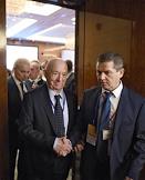 Внеочередная конференция Российского футбольного союза (РФС) прошла в гостинице "Лотте Отель Москва". Первый вице-президент РФС, председатель Технического комитета РФС Никита Симонян (в центре) и председатель правления ПАО "Газпром нефть" Александр Дюков, избранный президентом РФС, (справа) во время конференции.