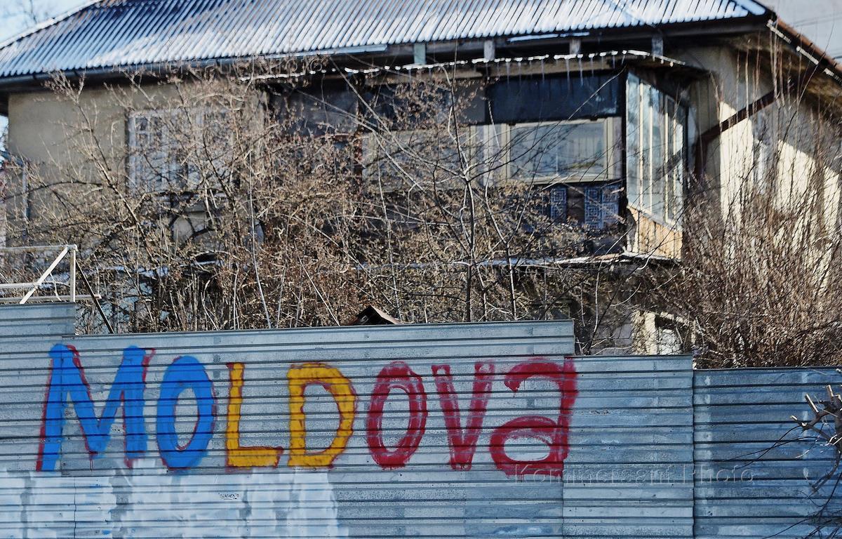 Парламентские выборы в Молдавии. Надпись Moldova на заборе перед жилым домом.