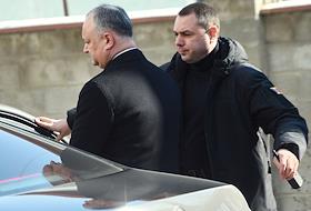 Парламентские выборы в Молдавии. Президент Молдавии Игорь Додон (слева) после голосования на выборах на одном из избирательных участков города.