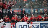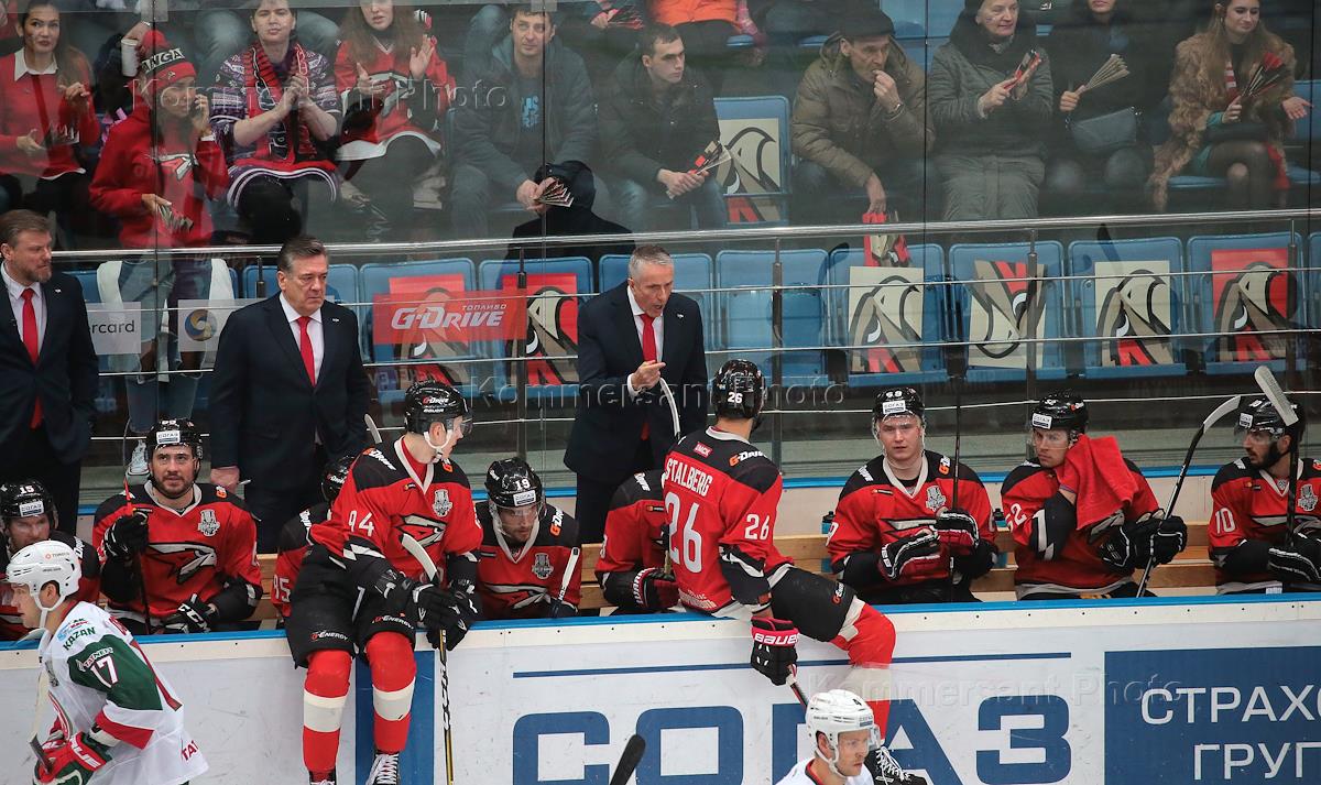 Континентальная хоккейная лига (КХЛ). 1/4 финала - Восток. Матч между командами "Авангард" (Омск) и "Ак Барс" (Казань) в ледовом дворце "Арена Балашиха". Главный тренер команды "Авангард" Боб Хартли (в центре) во время матча.
