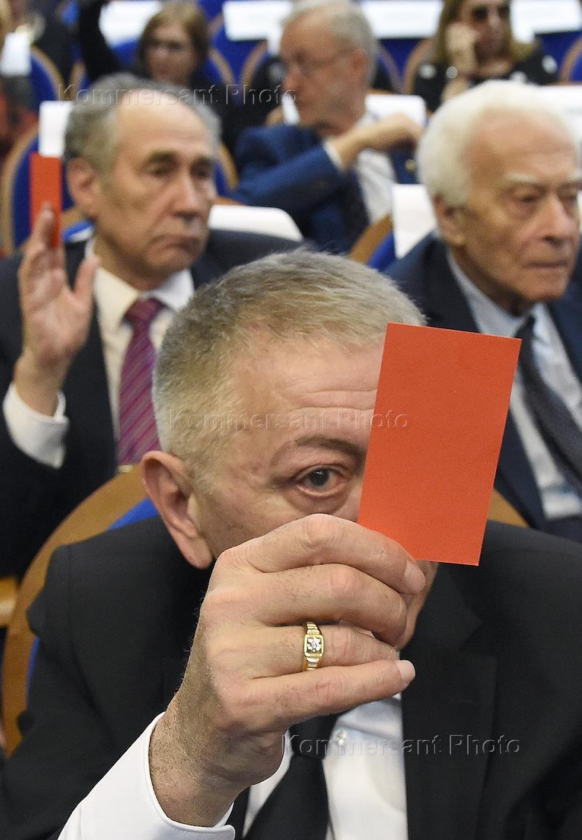 Общее собрание членов Российской академии образования (РАО). Академик РАО, декан факультета психологии Московского государственного университета имени М.В.Ломоносова, президент РАО Юрий Зинченко (слева) во время собрания.
