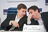 Гроссмейстер Сергей Карякин (слева) и исполнительный директор Федерации шахмат России Марк Глуховский (справа) во время пресс-конференции на тему "Международный шахматный турнир по блицу в Москве". Пресс-конференция прошла в агентстве ТАСС.