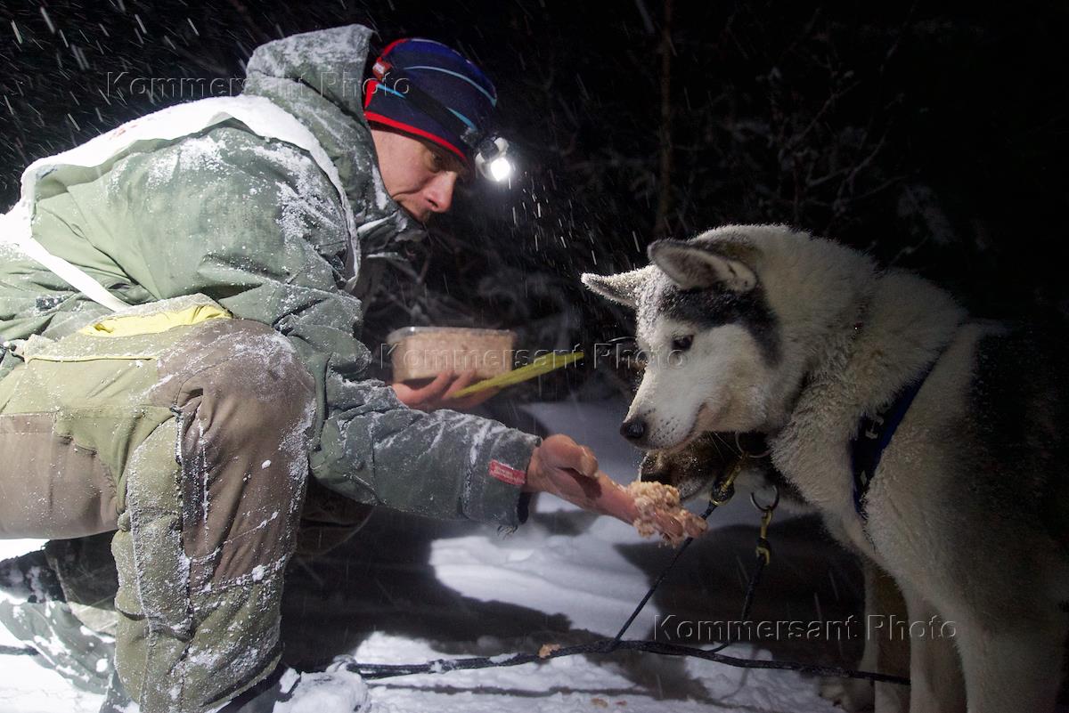 Международная этапная гонка в поддержку детей "Северная Надежда-2019". Собаки во время отдыха и еды.