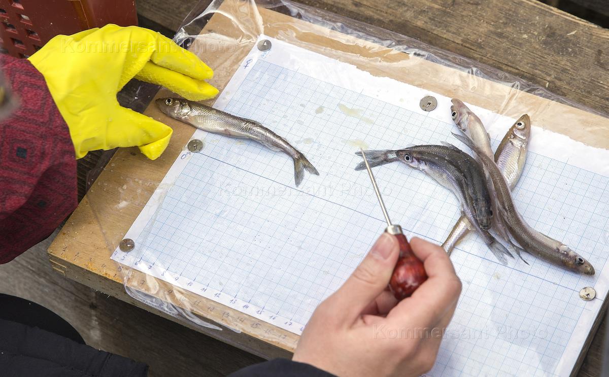 Жанровая фотография. Промысловый сезон корюшки. Сотрудник природоохранной организации во время измерения выловленной рыбы.