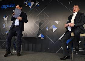 Междисциплинарная пленарная сессия "Открытость государства" прошла в рамках V ежегодного Дня открытых данных в Фонде развития интернет-инициатив. Председатель Счетной палаты России Алексей Кудрин (справа) во время сессии.