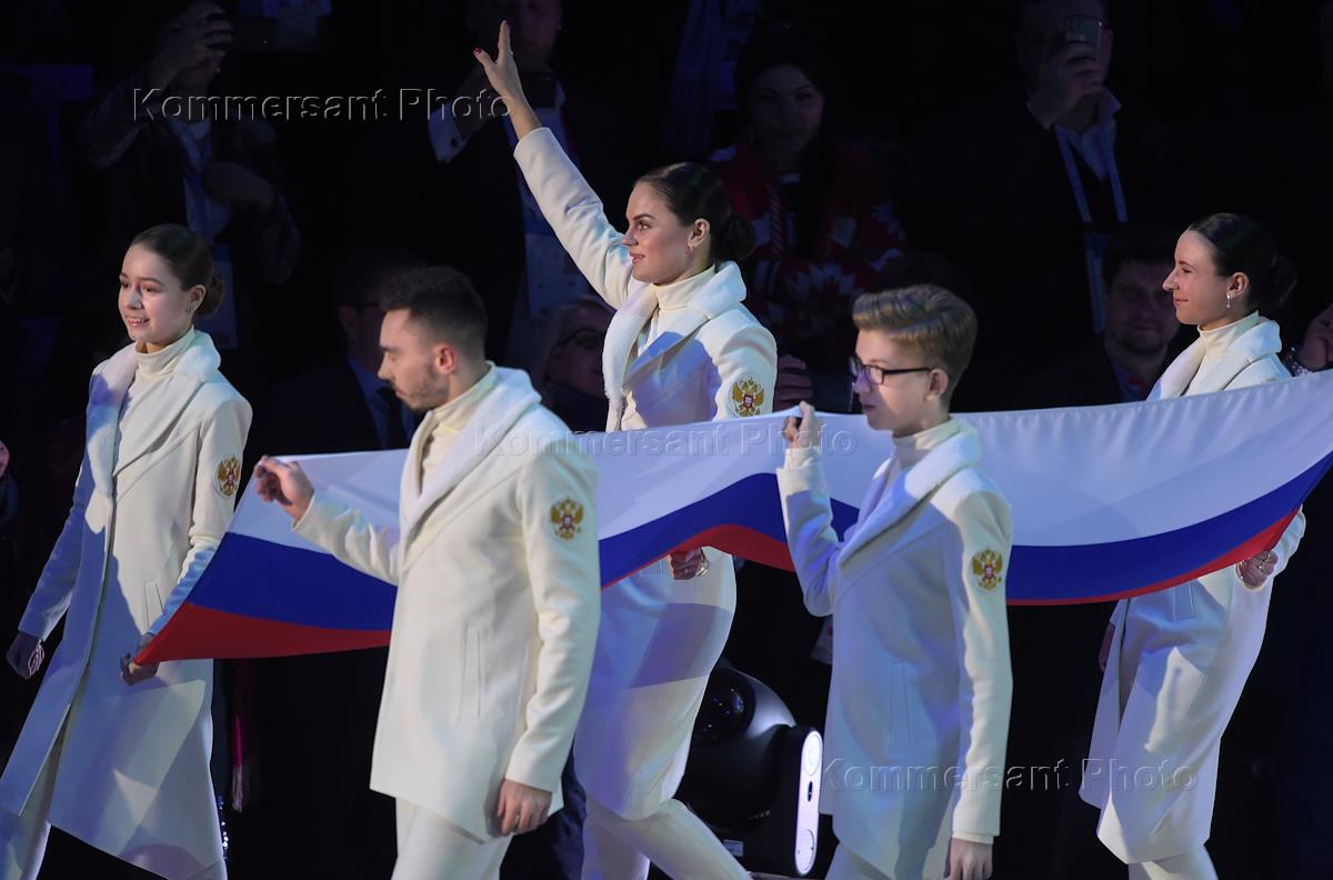 Рабочая поездка президента России Владимира Путина в Красноярск. Церемония открытия XXIX Всемирной зимней универсиады в ледовом дворце "Платинум-Арена Красноярск". Президент FISU Олег Матыцин (вверху слева) и президент России Владимир Путин (вверху в центре) во время церемонии.