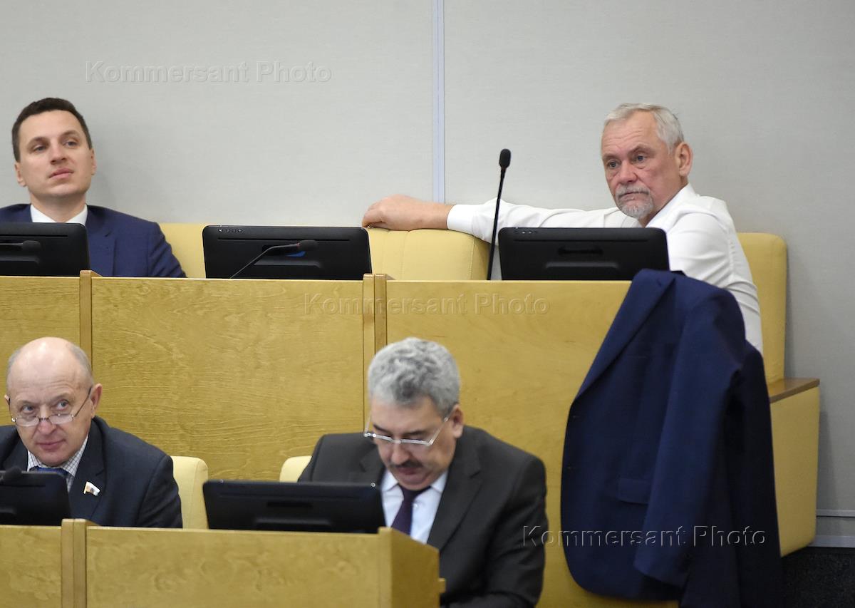 Пленарное заседание Государственной думы (ГД) России. Председатель комитета ГД России по экологии и охране окружающей среды Владимир Бурматов (в центре) перед началом заседания.