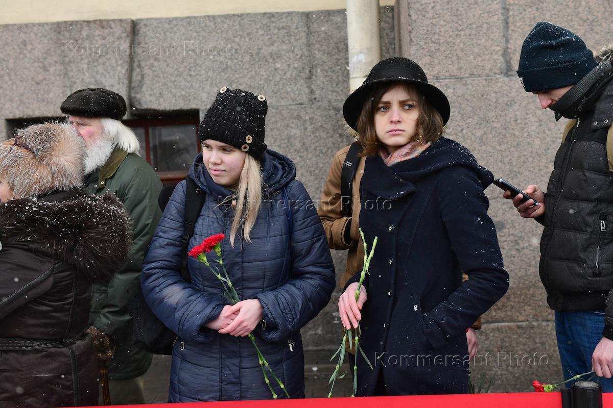 Церемония прощания с членом комитета Государственной думы России по образованию и науке, академиком РАН Жоресом Алферовым в Санкт-Петербургском научном центре РАН на Университетской набережной. Девушки с цветами в очереди в здание РАН.