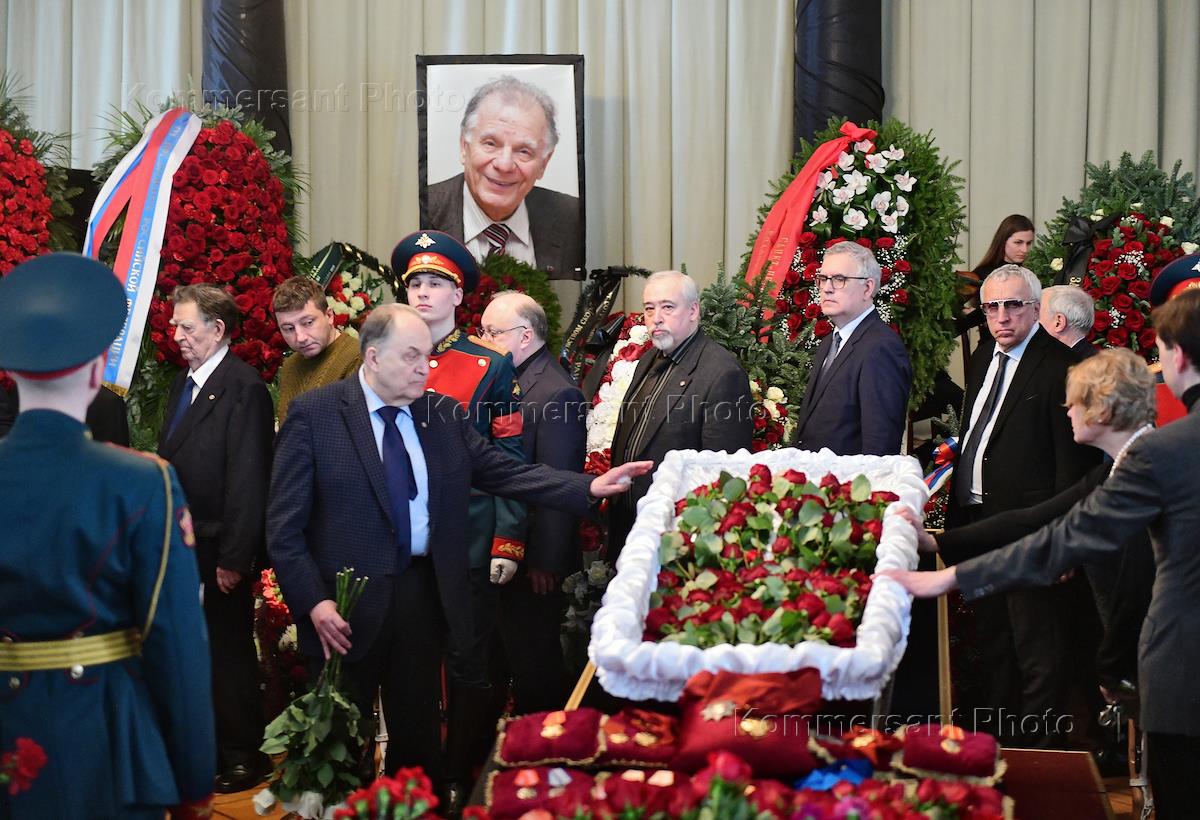 Церемония прощания с членом комитета Государственной думы (ГД) России по образованию и науке, академиком РАН Жоресом Алферовым в Санкт-Петербургском научном центре РАН на Университетской набережной. Первый заместитель председателя комитета ГД России по культуре Владимир Бортко (в центре) на церемонии.