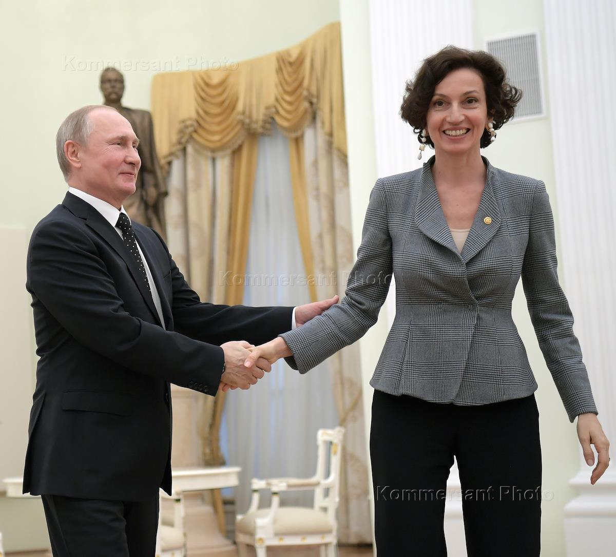 Президент России Владимир Путин (слева) и генеральный директор ЮНЕСКО Одре Азуле (справа) во время встречи в Кремле.
