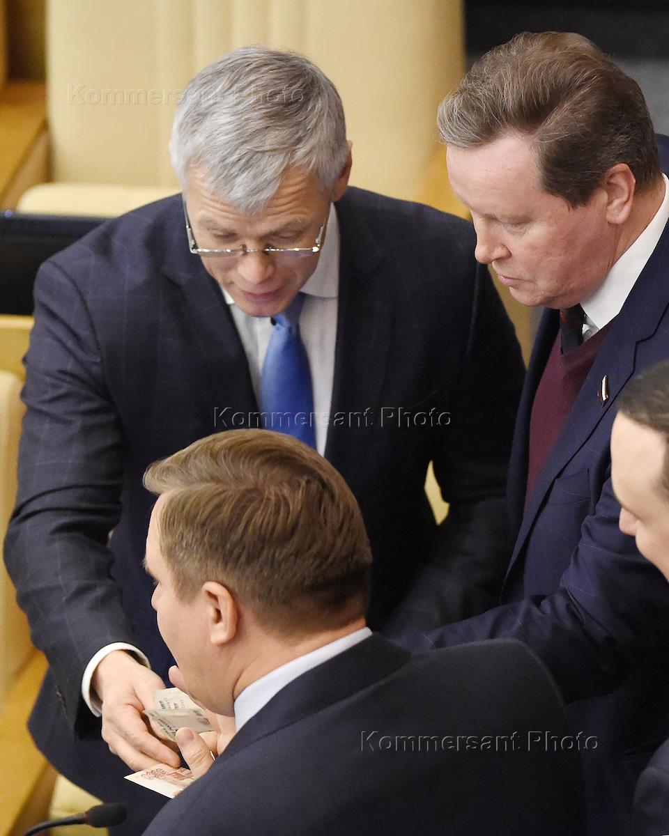Пленарное заседание Государственной думы (ГД) России. Слева направо: член комитета ГД России по аграрным вопросам Алексей Езубов (слева) перед началом заседания.