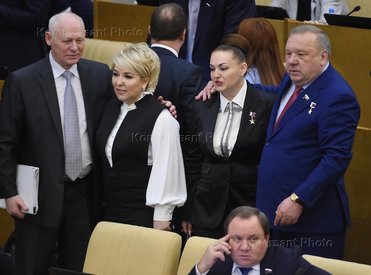 Пленарное заседание Государственной думы (ГД) России. Справа налево: председатель комитета ГД России по обороне Владимир Шаманов, первый заместитель председателя комитета ГД России по бюджету и налогам Ирина Гусева и заместитель председателя комитета ГД России по экологии и охране окружающей среды Елена Серова перед началом заседания.