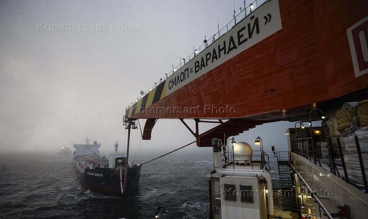Отгрузочный терминал компании "Лукойл" в поселке Варандей (Варандейский терминал), предназначенный для экспорта морским путем нефти, добываемой в Тимано-Печорской нефтегазоносной провинции. Танкер "Василий Динков" во время заливки нефти.