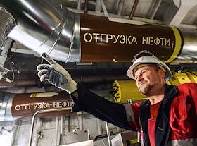 Отгрузочный терминал компании "Лукойл" в поселке Варандей (Варандейский терминал), предназначенный для экспорта морским путем нефти, добываемой в Тимано-Печорской нефтегазоносной провинции. Надпись на трубе "Нефть на танкер".