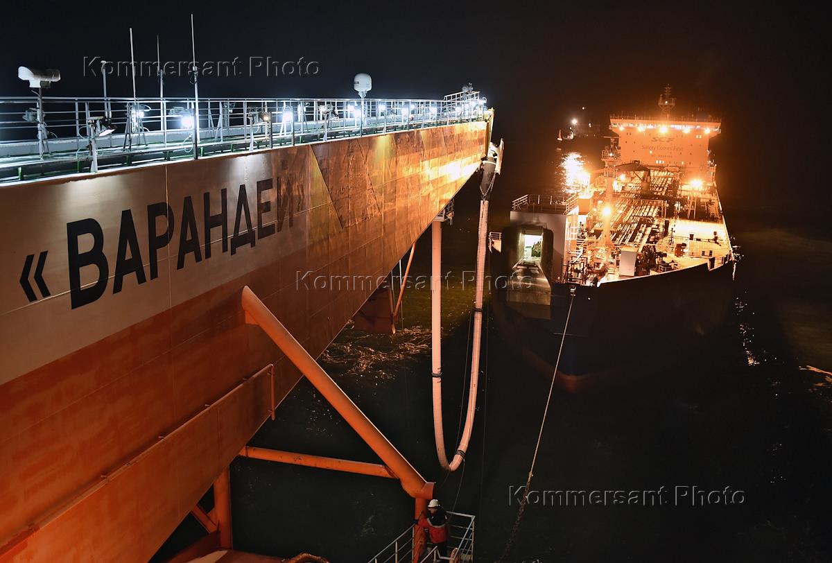 Отгрузочный терминал компании "Лукойл" в поселке Варандей (Варандейский терминал), предназначенный для экспорта морским путем нефти, добываемой в Тимано-Печорской нефтегазоносной провинции. Танкер "Василий Динков" во время заливки нефти.