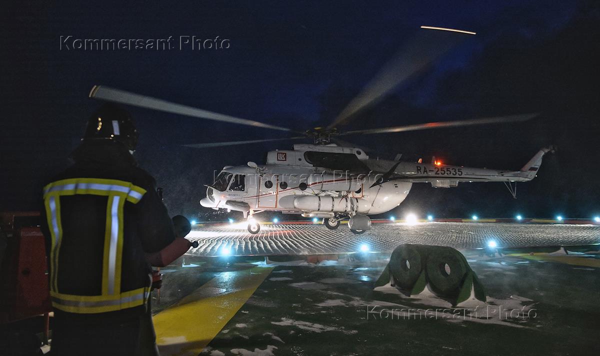 Отгрузочный терминал компании "Лукойл" в поселке Варандей (Варандейский терминал), предназначенный для экспорта морским путем нефти, добываемой в Тимано-Печорской нефтегазоносной провинции. Вертолет на платформе.
